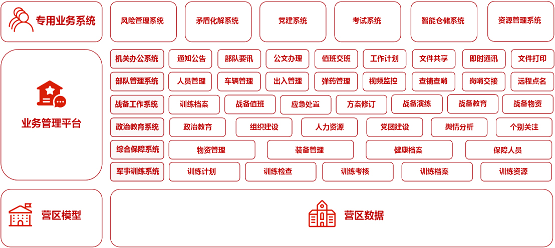 部隊管理系統 機關辦公系統 軍事教育系統 智慧政工系統 軍事訓練系統 后勤保障系統 智慧安防系統 裝備管理系統